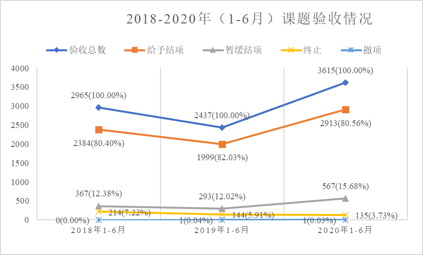 国家不同层次的科研管理政策越来越规范,原来“重立项、轻过程、轻结题”的现象需要改变。近三年来,各层次基金项目保质保量完成的比例并没有得到明显提升,以国家社科基金项目为例,“暂缓结项”和“终止”比例仍然居一定的高位。据全国哲学社会科学办公室网站统计,2018年、2019年、2020年的上半年(1-6月)结题情况,“暂缓结项”和“终止”仍然高达20%。(如下图)