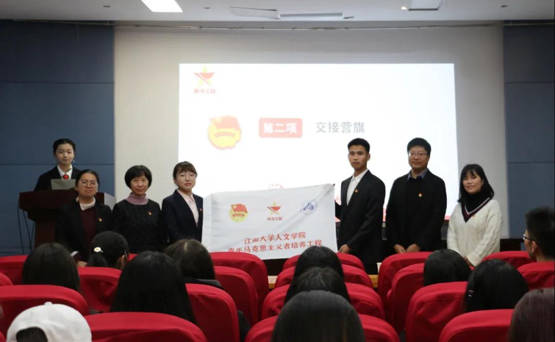 仪式上,首先由第二届青马训练营优秀学员代表陆梦欣同学发言。她和同学们分享了自己在青马的学习和成长。随后,四位领导老师分别为结业代表颁发了结业证书。接下来,第三届青马训练营学员代表廖闻渊同学作为新学员代表发言,向全体新学员发出倡议,在青马训练营中努力提高自身思想道德素质,增强奉献意识、服务意识、责任意识,锻炼品格意志,提高为同学服务的工作水平,争做优秀“青马人”。紧接着,两届青马学员在团歌声中进行了营旗交接,营旗是青马精神的象征,营旗交接,则是意在将青马精神薪火相传,接过营旗后,四位老师又为新学员代表佩戴了写有本人姓名的青马徽章。