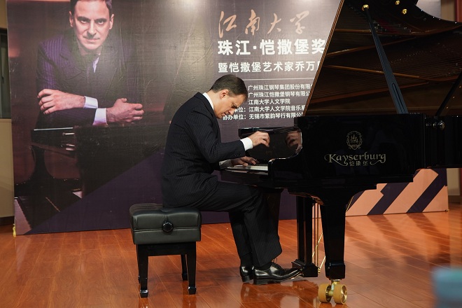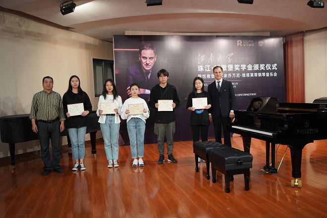 颁奖仪式结束后,美妙的音乐会开始。乔万尼·维塔莱蒂是珠江恺撒堡艺术家、意大利“蒙特威尔第”音乐学院副院长、钢琴系主任、布索尼国际钢琴比赛组委会委员、意大利博尔扎诺钢琴音乐节创始人及艺术总监、西安音乐学院外籍专家教授。他精通作曲、指挥和古钢琴,其演出足迹遍布全球上百个城市及重要音乐厅,先后在伦敦国家剧院、美国纽约林肯中心、北京大学百年纪念堂等地留下了他的身影。同时,他还为意大利和德国国家广播电台录制了21套节目,具有深远的影响力,受到中外媒体报刊的广泛赞誉。担任本次音乐会演奏嘉宾的是旅意青年钢琴演奏家、西安音乐学院钢琴系教师——王娜女士。音乐会共演奏了12首钢琴作品,从与王娜女士的四手联弹作品《匈牙利狂想曲》到独奏《基辅大门》他都以细腻的音乐语言、娴熟的演奏技巧完美的展现出来。语言文字有国界,但音乐没有。台下观众们专注的神情和那些陶醉的目光就是最好的证明。