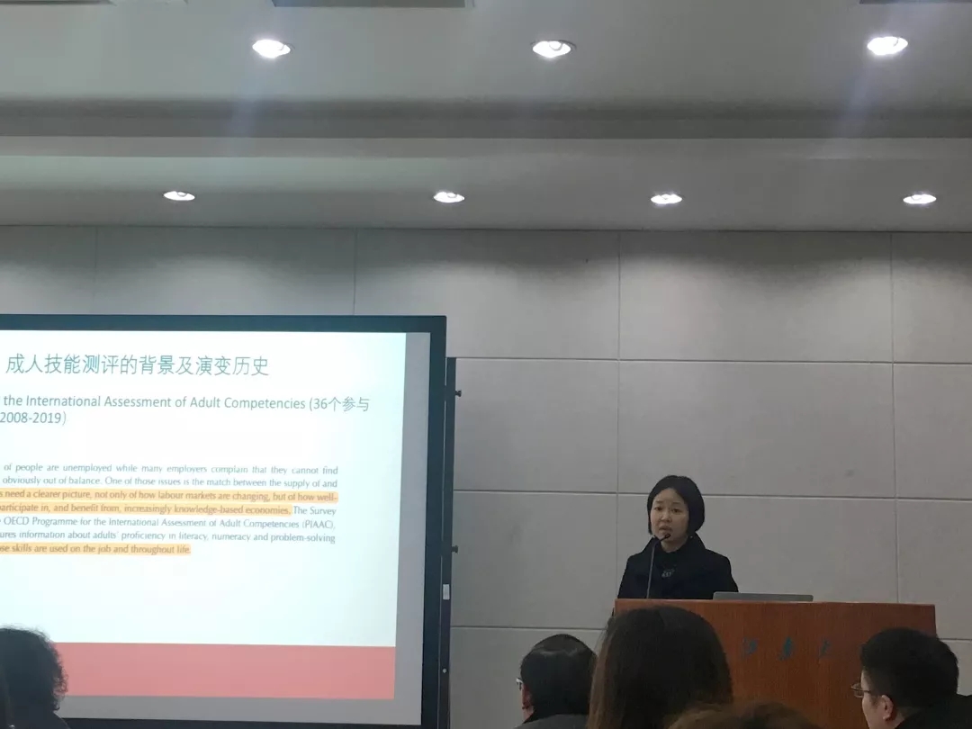 交流会伊始,主持人致辞,对刘博士及与会嘉宾的到来表示了热烈欢迎。随后,刘华聪博士以“什么是文盲”作开篇发问,通过纺织工人和高新技术人才的图片对比,阐释了当代“功能性文盲”的定义,进而对成人技能测评进行诠释。此外,刘华聪博士向师生们介绍了PIAAC对三类基本技能的定义,PIAAC的基本概况以及该评估体系对成人阅读、数理能力测试的基本操作情况,向全院师生们展示了世界不同国家在该项测试中的研究结果。进而,刘博士着重强调了社交情感能力的重要性。她就研究中的两个问题,提出PIAAC数据库中的社交情感能力,并以2005—2017年以色列、德国、美国三个国家的产业结构变化为例,分析了社交情感因素在弥补认知能力方面发挥的重要作用。最后,刘博士就蕾丝视频
