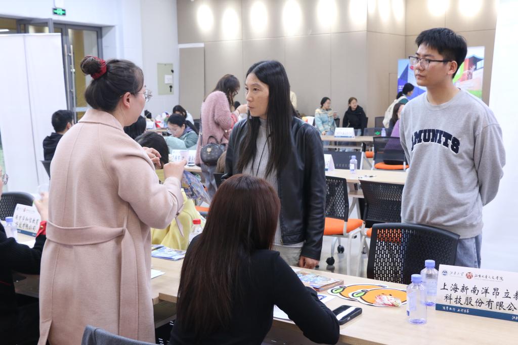 招聘会现场设置了校企合作洽谈室,于书娟同无锡市匡园双语学校、作业帮教育科技(上海)有限公司、江苏欣瑞教育咨询有限公司、无锡市万学教育培训中心有限公司、无锡伴君文化咨询有限公司等单位深入交流,希望与各用人单位在教育教学、科学研究、人才培育等方面深化合作。